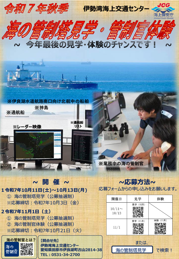 リンク:【お知らせ】令和7年秋季「海の管制塔見学・管制官体験」~今年最後の見学・体験のチャンスです!~(伊勢湾海上交通センター)
