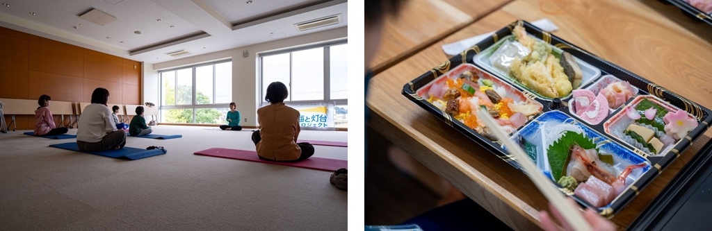 灯台上部からは伏木港や富山湾の広がりを一望し、晩秋の景色を満喫。ツアーの後半では、室内での簡単なヨガを通じて心身を整え、地域食材を取り入れた弁当の提供や温泉での入浴を組み合わせ、ゆったりと過ごす体験を用意しました。
