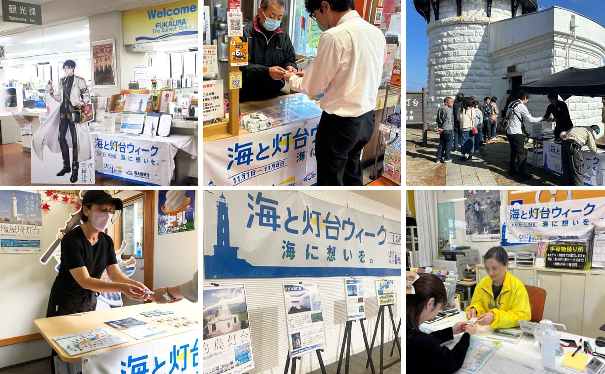 「海と灯台のまち」自治体の庁舎や観光施設などに、横断幕・ポスターを掲示して「海と灯台ウィーク」をPR。記念品(ステッカー)のプレゼントも!